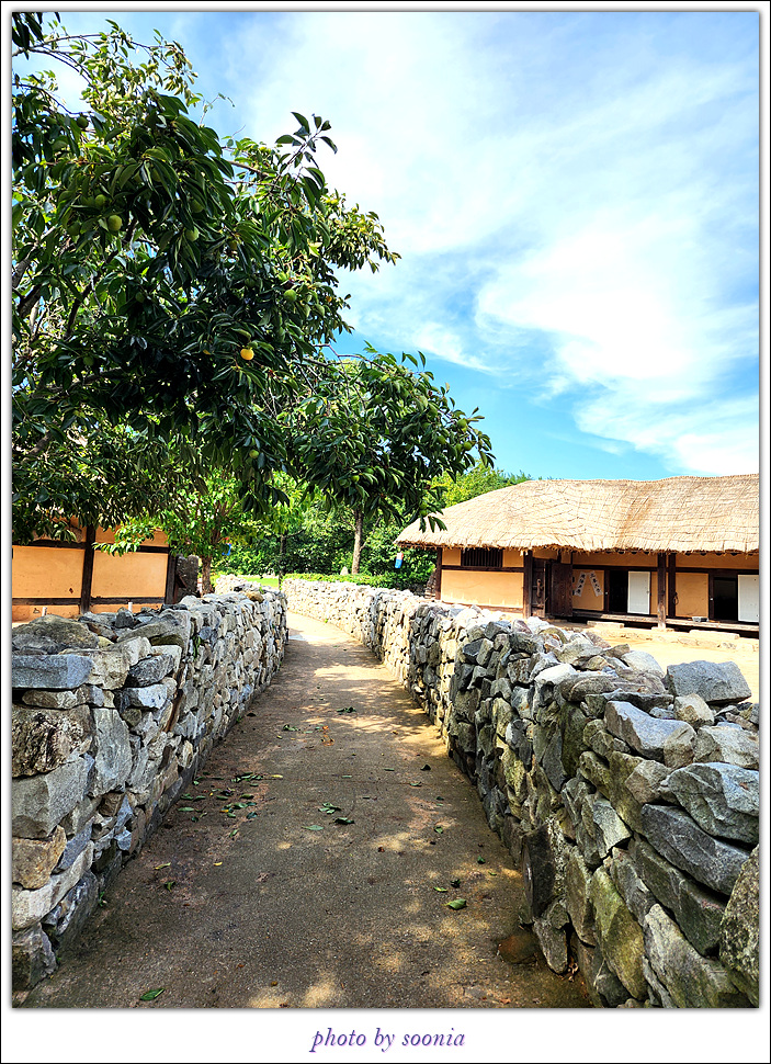 돌담으로 둘러싸인 초가집도 정겹고